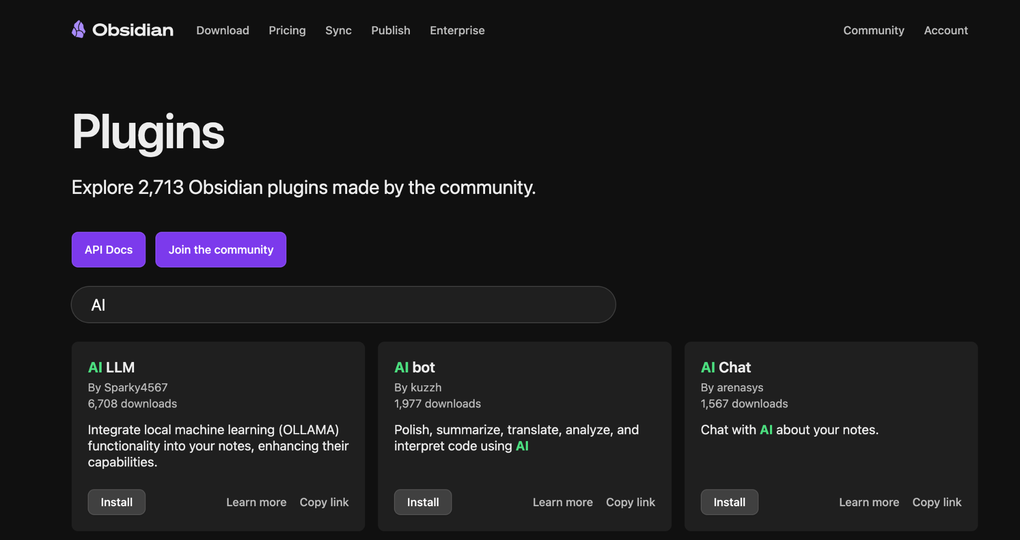 • AI capabilities through plugins (Copilot, Smart Connections, AI Chat)