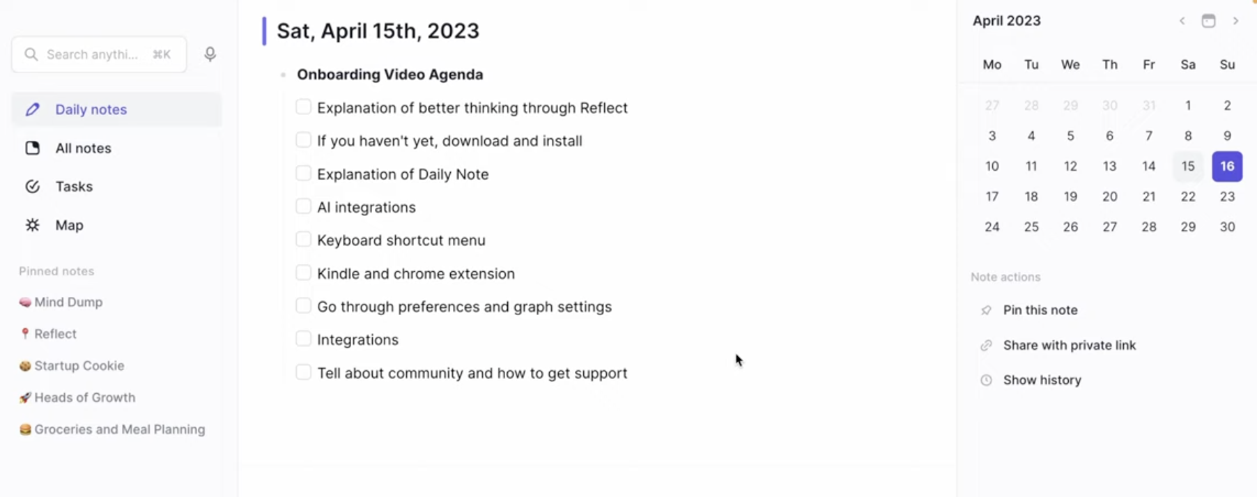 Reflect is a daily notes app with backlinks and AI. You get a new note each day. You write. It links. The AI (GPT-4 and Whisper) can transcribe voice notes, generate summaries, answer questions about your notes. Google Calendar integration puts your meetings in the sidebar, ready for notes.